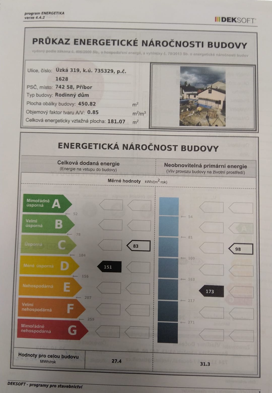Energetická náročnost budovy (PENB): třída D – méně úsporná.
