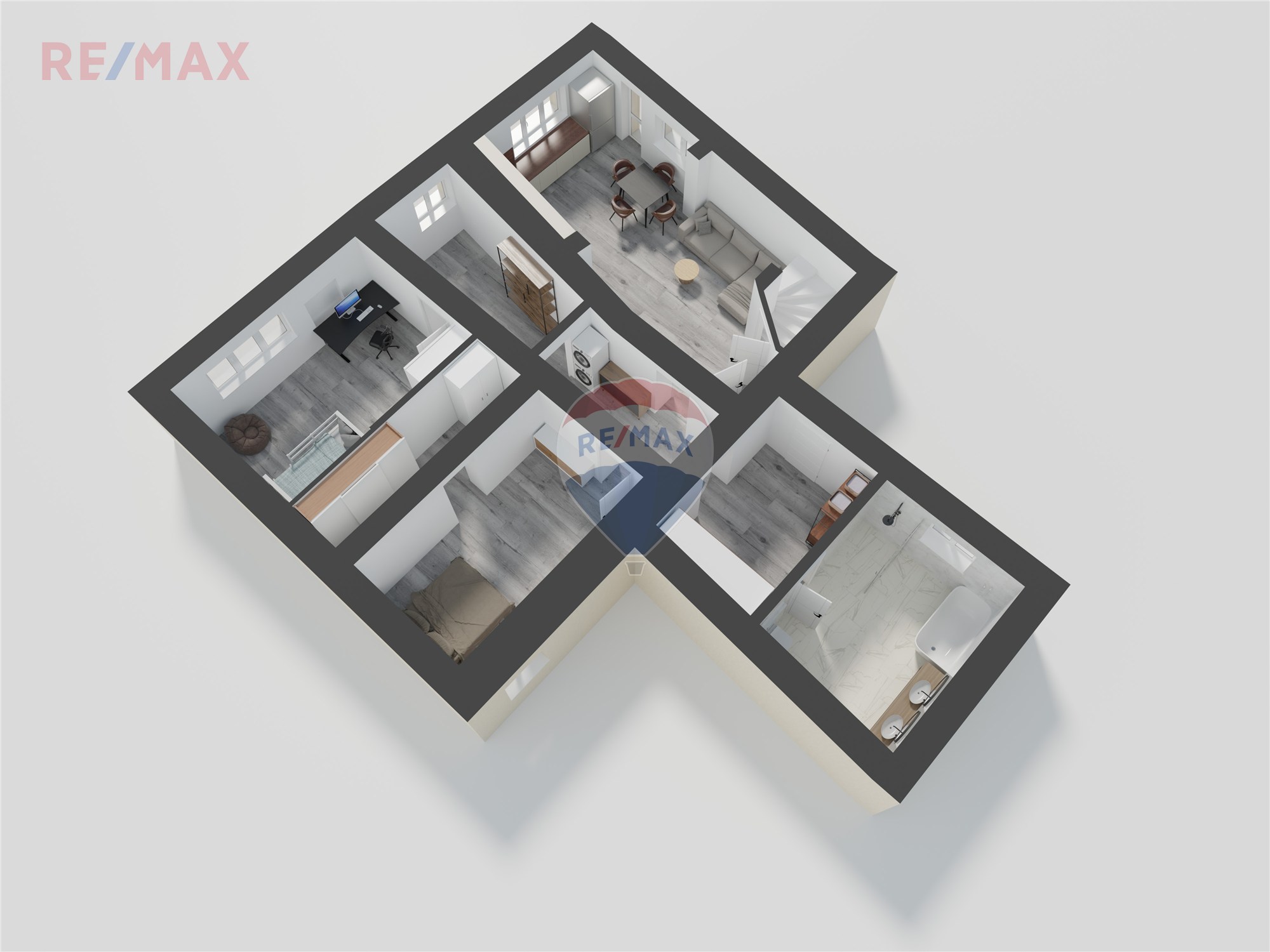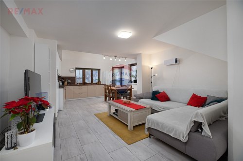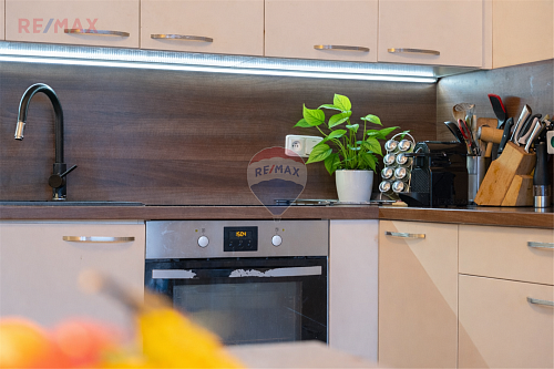 Kuchyňská linka je vybavena troubou, indukční varnou deskou a myčkou nádobí. K dispozici je elegantní koupelna s vanou i sprchovým koutem, ideální pro každodenní komfort i relax.
